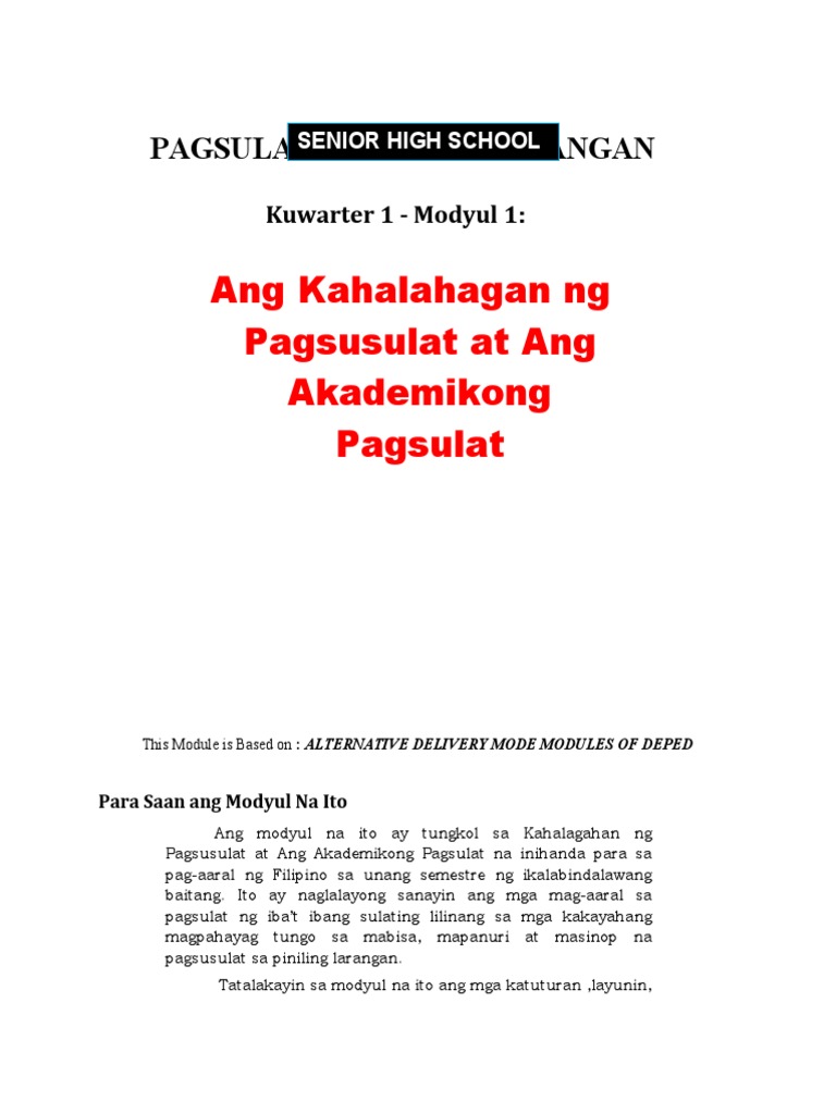 SENIOR HIGH SCHOOL ENHANCED LEARNING MODULE FILIPINO SA PILING LARANGAN AKADEMIK 11 Ang modyul na ito ay tungkol sa Kahalagahan ng Pagsusulat at Ang Akademikong Pagsulat. Ito ang layunin sa pagsasagawa ng pagsulat na maaaring panlipunan o sosyal kung saan ang layunin ng pagsulat ay nakabatay sa pansariling pananawkaranasannaiisip o nadarama ng manunulat. Pagsikapang gawan ng buod ang binasang teksto Maaaring ibatay ito sa alinman sa sumusunod.