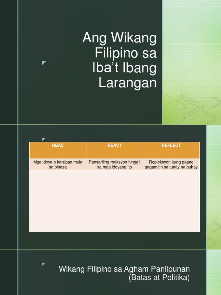 Ang Wikang Filipino Sa Iba T Ibang Larangan Pdf