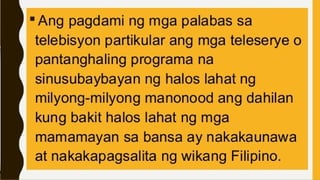 Tolentino 170JOURNAL NG WIKANG FILIPINO 171 Hindi rin lubhang mabisa ang papel ng UP sa pagpapalaganap ng wikang pambansa sa larangan ng media at komunikasyon. Ang wika natin ngayon ay natatabunan ng ibang mga lenggwahe lalo na sa social media na kung saan Ingles ang isa sa mga lenggwahe na ginagamit ng mga pilipino.