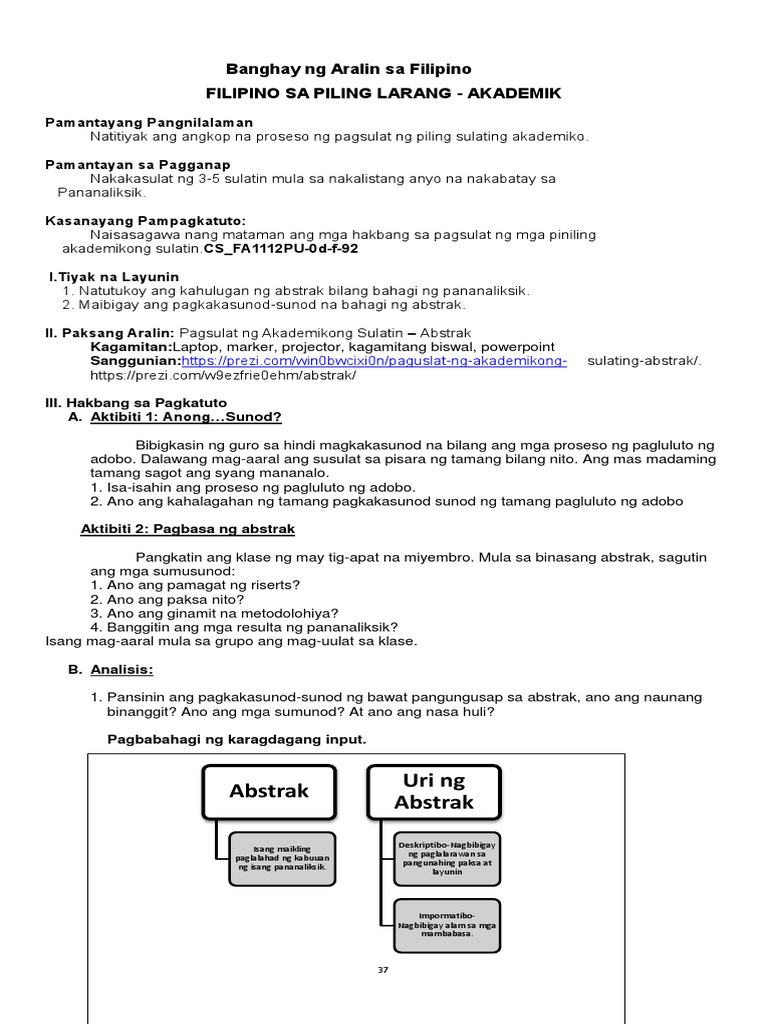 -Pagpapabasa ng isang halimbawa ng Abstrak Pagsulat sa Filipino sa Piling Larangan. 1 full pdf related to this paper. Filipino sa piling larang akademik patnubay ng guro ang aklat na ito ay magkatuwang na inihanda at sinuri ng mga edukador mula sa mga publiko at pribadong paaralan kolehiyo at o unibersidad.