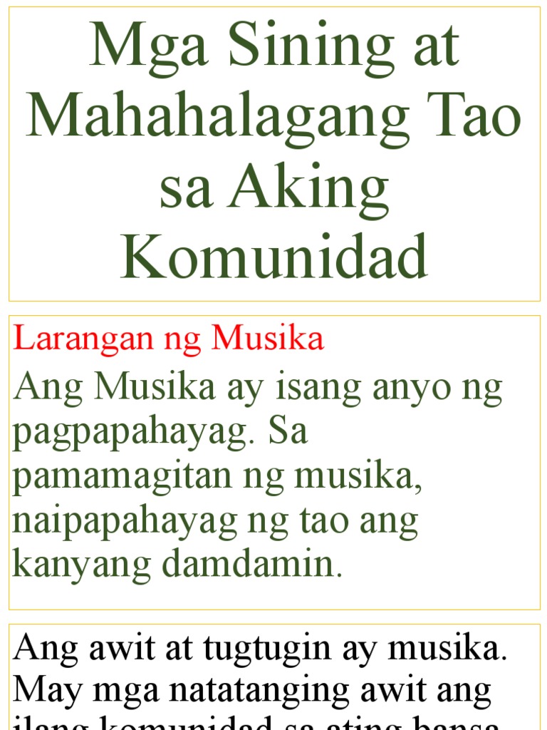 Si Lea Salonga ay nakilala sa kanyang mga kontribusyon sa larangan ng musika. Brillante mendoza - larangan ng pelikula. Suriin at pag-aralan ang nilalaman ng awitin.