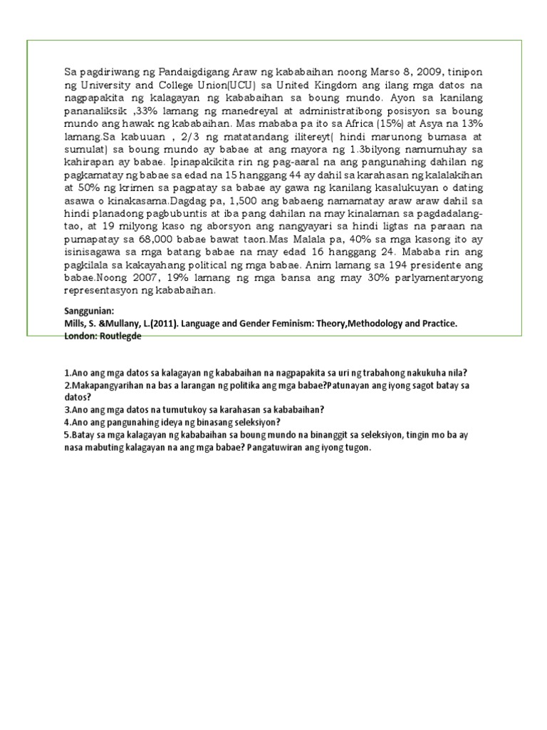 Makapangyarihan ba sa larangan ng politika ang mga babae. Ano ang mga datos na tumutukoy sa karahasan sa kababaihan. Ano ang pangunahing ideya ng binasang selesyon.