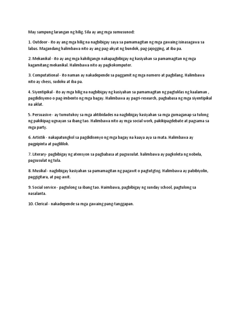 Ang mga hilig ay preperensya sa mga partikular na uri ng gawain. Profayl Ko Noon at Nga yon Panuto. Ang pagbasa ay isang magandang gawain kung kayat maraming naidudulot na magandang bagay sa isang tao.