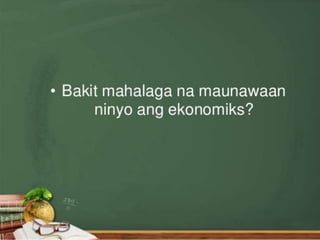 Kaugnayan ng ekonomiks at iba pang larangan ng pag aaral. Ang ekonomiks ay ang pag-aaral ng mga pamamaraan kung paano nagbabahagi ang mga mamamayan at bansa ng kanilang limitadong pinagkukunang-yaman upang matugunan ang kanilang walang katapusang kagustohanAng ekonomiks rin ay isang pag-aaral kung paano gagamitin ng tao at lipunan ang limitadong pinagkukunang-yaman upang makagawa at. Kahalagahan ng Pag-aaral ng Ekonomiks Nagbibigay sa tao ng mga kaalamang makatutulong sa paggawa ng mga desisyon. Pinagkukunang yaman at iba pang aspektong pisikal ng mga tao.