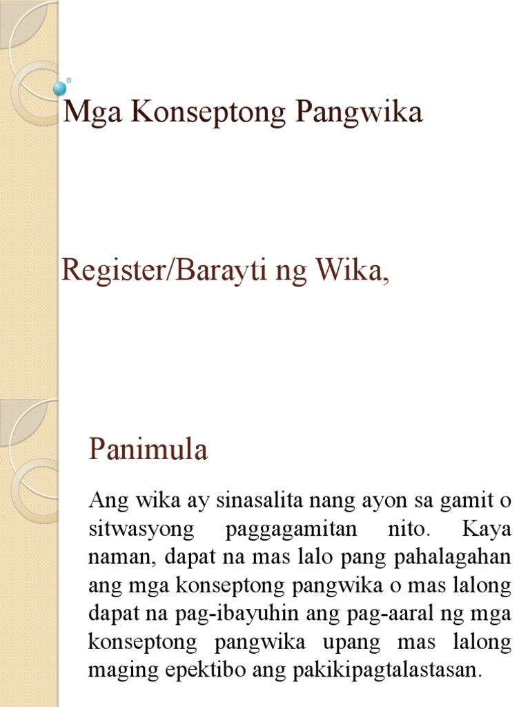 Ang wika ay ang pangunahing instrumento ng komunikasyon. Espesyal na katangian ng mga register ang pagbabagong kahulugang taglay kapag ginamit na sa ibat ibang disiplina o larangan 9. Ang wikang Pilipino ay may ibat ibang barayti na nakadepende kung paano ito ginagamti.